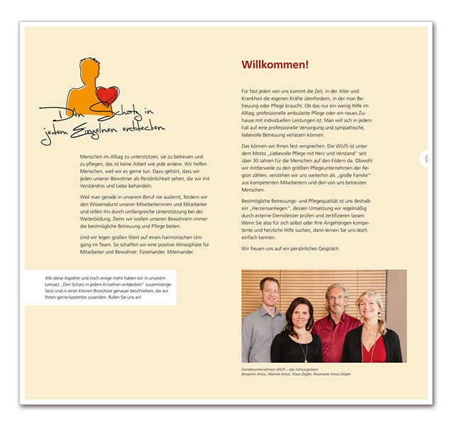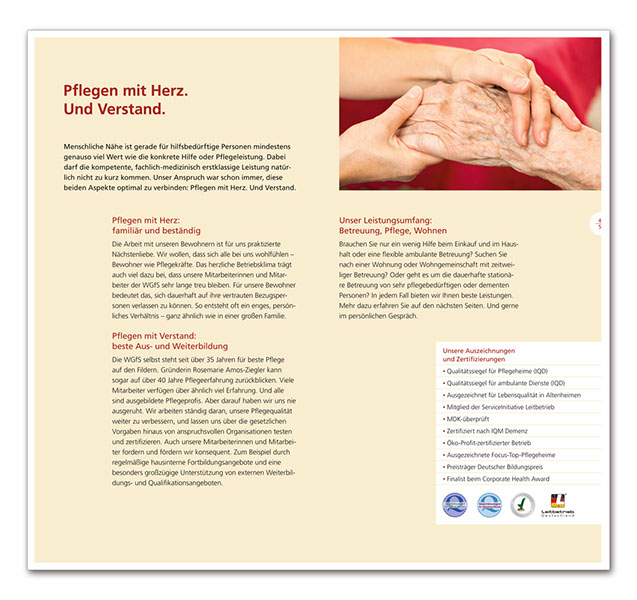 Konzeption und Umsetzung der Bildidee, Logo-Re-Design, Umgestaltung aller internen und externen Kommunikationsmittel wie Geschäftsdrucksachen, Kundenordner und -mappen, Anzeigen, Imagebroschüre, Newsletter, Flyer, PowerPoint-Präsentationen, Info-Systeme für Monitore sowie hausinternes Infomaterial für Mitarbeiter, Bewohner und Angehörige.