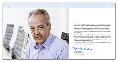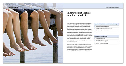 Aufgabe war, eine Imagebroschüre zu konzipieren, die über das Unternehmen ERGO Direkt informiert und Produkte und Leistungsspektrum überzeugend in Bild und Text darstellt. Die Broschüre wird von ERGO Direkt für B2B-Partner eingesetzt, die sie wiederum als Information für potenzielle Partner im Rahmen der Akquise nutzen.